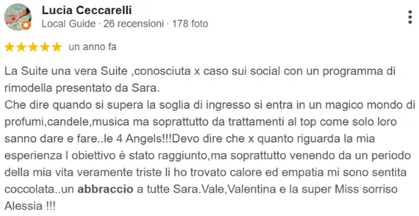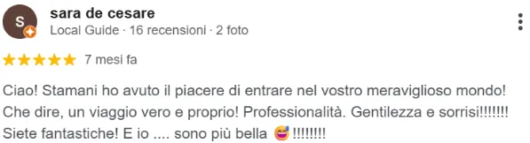 “Che dire, un viaggio vero e proprio! Professionalità, gentilezza e sorrisi! Siete fantastiche! E io… sono più bella!”