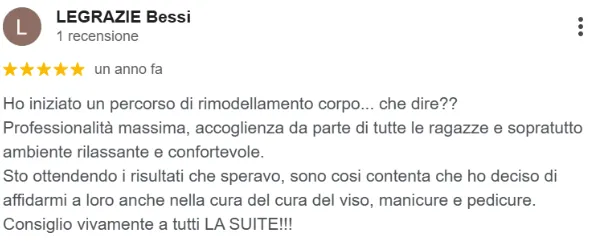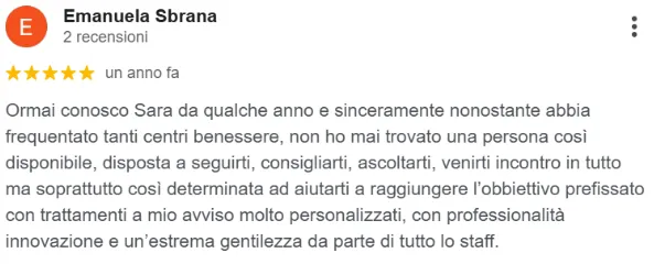 “Ho intrapreso con Sara e le sue assistenti un percorso di ristruttura corpo. Sono estremamente contenta dei risultati ottenuti dopo solo cinque trattamenti che vanno ben oltre le mie e le loro aspettative”